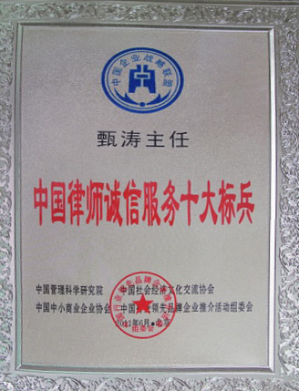 我所甄涛律师荣获“中国律师诚信服务十大标兵”的称号