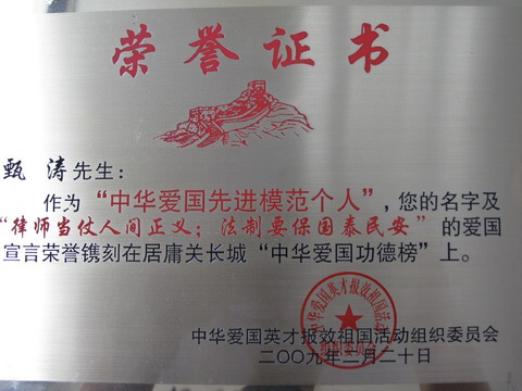 我所甄涛律师的“律师当仗人家正义;法制要保国泰民安”的爱国宣言荣誉刻在居庸关长城“中华爱国功德榜”上