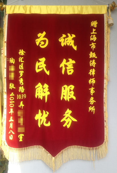 为当事人维权解忧取得成功,当事人赠与我所的锦旗