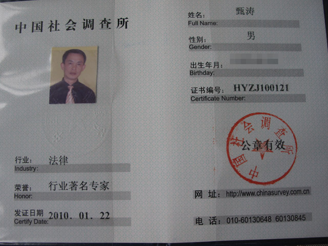 我所甄涛律师荣获中国社会调查所“行业著名专家”称号