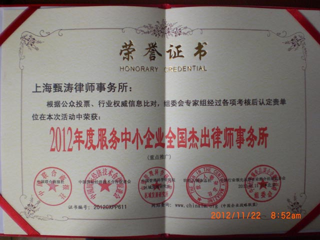 我所荣获“2012年度服务中小企业全国杰出律师事务所”称号